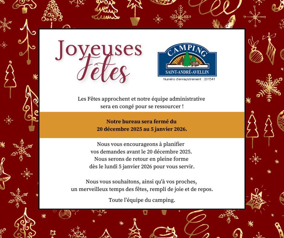 Le Camping Saint-André-Avellin aspire à être un refuge idéal où nature, détente et aventure se rencontrent. Nous souhaitons offrir à chaque visiteur une expérience immersive en pleine nature, tout en garantissant un service de qualité et un lieu propice à la détente en famille ou entre amis. Notre vision est de devenir un site touristique incontournable pour les amoureux de plein air, un endroit où les souvenirs sont créés autour de feux de camp, de randonnées, et de moments partagés au cœur d’une nature. Nous souhaitons que chaque séjour au Camping Saint-André-Avellin soit une occasion d’échapper au quotidien, de reconnecter avec l’environnement et de vivre des moments authentiques dans un cadre chaleureux.